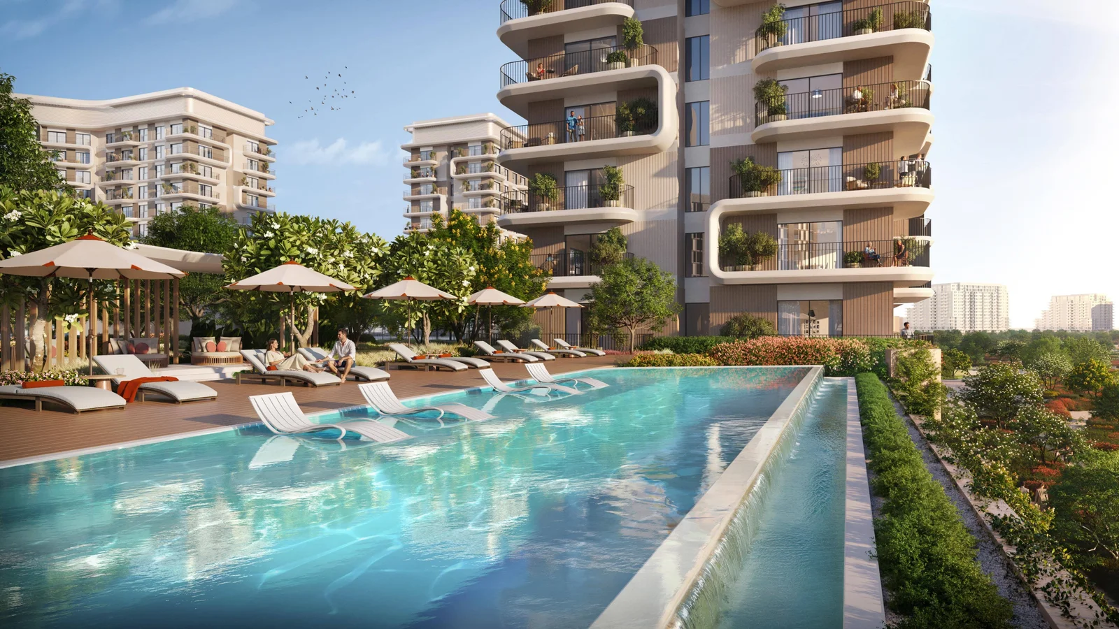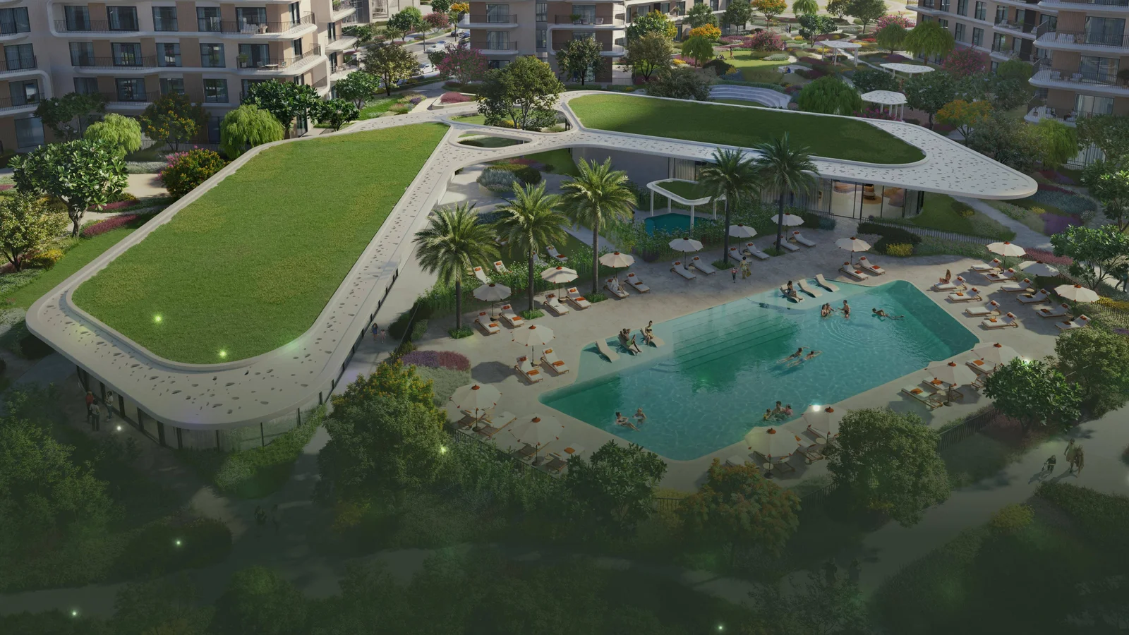- Luxury amenities including infinity pool, wellness gardens, co‑working spaces, and outdoor cinema